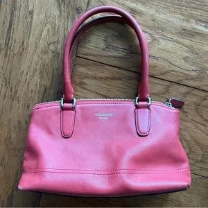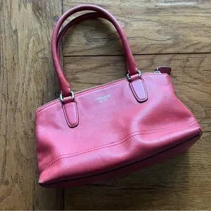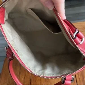 Cutest little day purse.. few stains near the zipper on the inside but it’s got loads of life left! Prettiest shade of red (which is the truest in the 3rd picture) for the perfect pop of color. Measures 10” across the top, 12” at the base, 7” tall and 4” wide.
