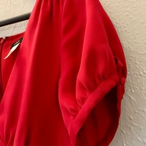 This bias-cut, ruby red dress with low-profile puff sleeves and button details gives a nod to 1940s style with modern appeal. No tags, but never worn nor washed.