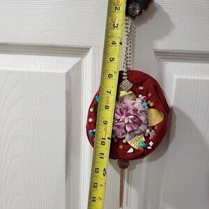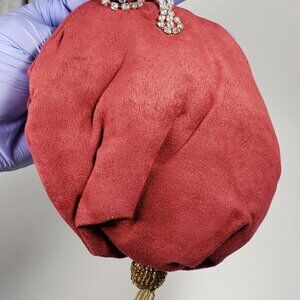 Make a bold and unique style statement with this one-of-a-kind red coin purse, adorned with vibrant embellishments! Featuring a beautiful pink satin rosette flower at the center, framed by gold-tone leaves, faux pearls, colorful stones, and a sparkling rhinestone chain strap, this compact accessory adds flair to any outfit.