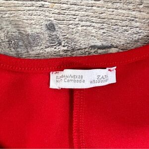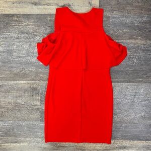 Eye-catching red dress with a dramatic ruffle overlay and cold-shoulder design. Slim, bodycon silhouette flatters the figure. Perfect for evening events or special occasions. Available in bold red for a confident look.