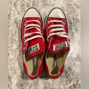 Classic red Converse sneakers. Worn a few times. Some scuff and spots on white bottoms. Few spots on shoelaces (easy to replace)