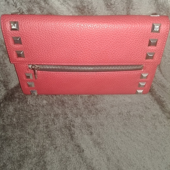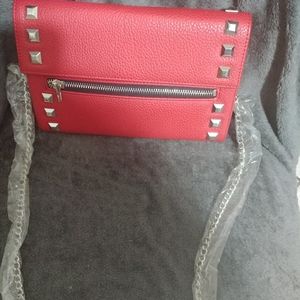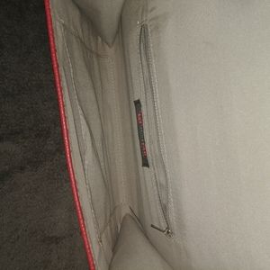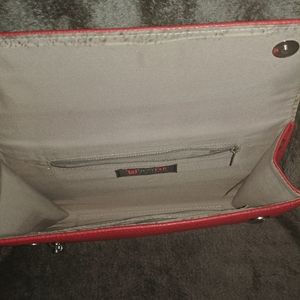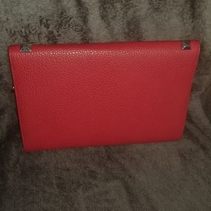 This versatile bag is stunning! Red in color with silver detail, this bag comes with a detachable silver chain that gives the bag the ability to be carried as an evening bag. Additionally, this bag comes with a detachable bracelet that can be worn to keep the bag connected to your arm, or the bracelet can be worn alone as a piece of statement jewelry. It can also be worn with without either attachment and carried as a clutch.