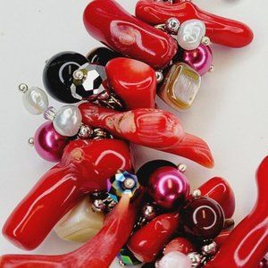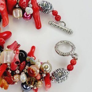 Red Coral Beads Bracelet with Pearls and multicolored Round Beads