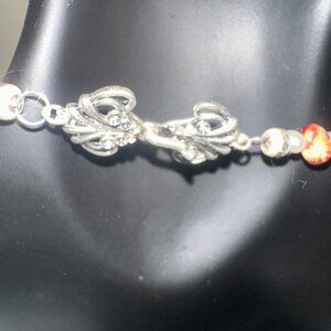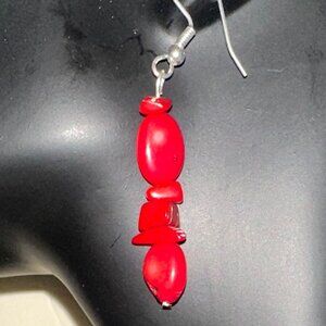 A 17" chain necklace made with red coral and white freshwater pearl with decorative hook clasp and matching wire earrings. This is a handmade one-of-a-kind set.