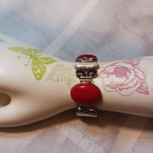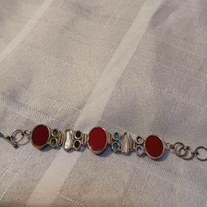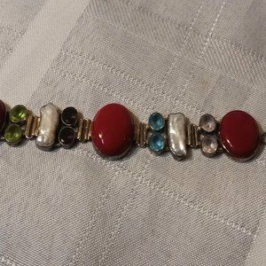 This gorgeous bracelet has been in my drawer for many years. I have a habit of buying but never wearing my jewelry. It is Sterling Silver { passed the magnet test} . Stones are Red Coral, Pearl, Peridot, Amethyst and Pink and Aqua Quartz. It has a toggle closure and will fit a 7-7 1/2 wrist.