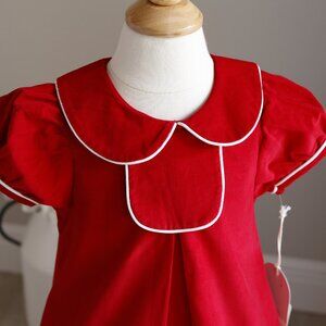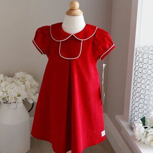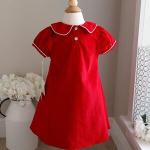 This Little Girl's red corduroy dress is a Preppy Classic!! The Peter Pan collar matches and has a white piping trim. The short puff sleeves are banded with a 1/2 band and have a matching white piping. The shift, A-line style is a Classic, no frill fit. A center pleat is an added feature that is placed just below a chest panel at the front center. Add a monogram for a special touch! The back has an upper button closure done in White contrasting buttons. Pair with black ballet flats or white tights with black Mary Janes. Finish-off with a White headband or white Hair bow. Brand New and Super Cute! Great for Seasonal or School Portraits. Coordinating brother and sister outfits/dresses available-see other listings. NWT