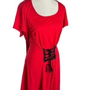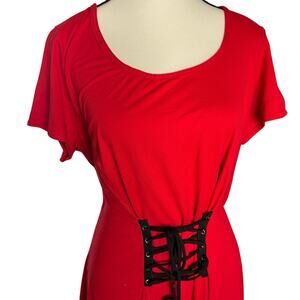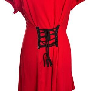 Details: Bold red short-sleeve dress featuring a flattering scoop neckline, attached black lace-up corset belt at the waist, and an asymmetrical handkerchief hemline for a flowing, dramatic look. Perfect for casual wear, costumes, or statement styling.