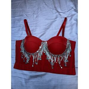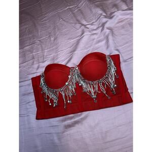 Red Corset Rhinestone Tassel Fringe Top - Size L (Stretchy)
