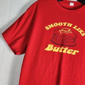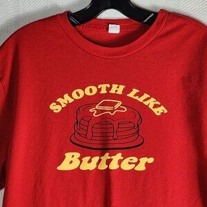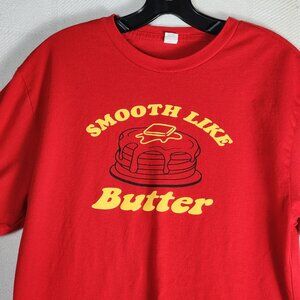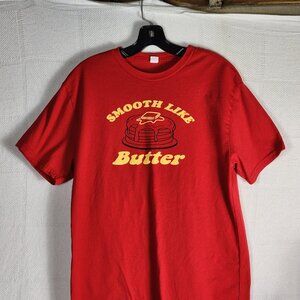 Red Cotton Poly Yellow Graphic Pancake Smooth Like Butter Short Sleeve T-Shirt Size L....Great Graphic Tee with a Cool Message.....Soft and Nice Colors.....Like Brand New.....
