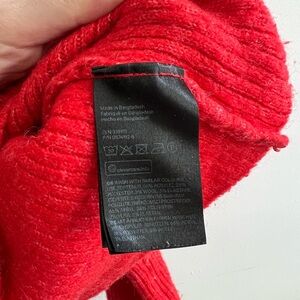 Cozy red ribbed knit sweater with long sleeves and a high neckline. Perfect for a stylish and warm look.