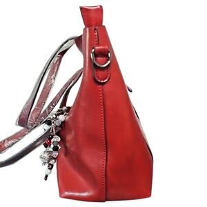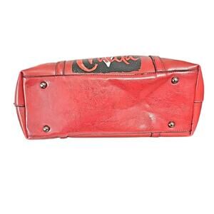 This red tote bag features a possibly hand-painted Cruella image, making it a truly unique piece. It comes with several purse tokens, including adorable Dalmatian charms and various color-coordinated beads, adding a playful touch.