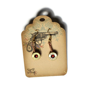 These Edgy Dangle Bullet Earrings are jazzed up with red Swarovski crystals. The earrings are made from two G.F.L. 357 magnum bullet head casings.