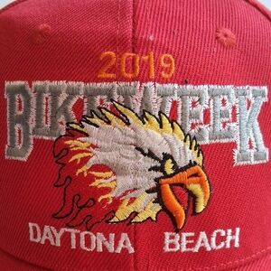 Red cap featuring Daytona Beach Biker Week embroidery with a colorful eagle design. New, never worn