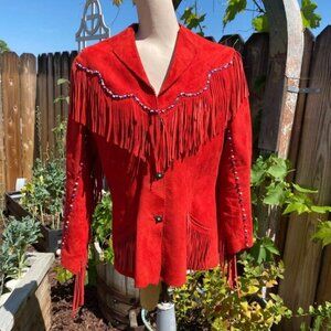 Vintage custom made red deerskin suede jacket made by ;Barbara Grimes of Gossamer Wings of Santa Fe. Her jackets originally sold for thousands and resell with high value as they are highly collected.
