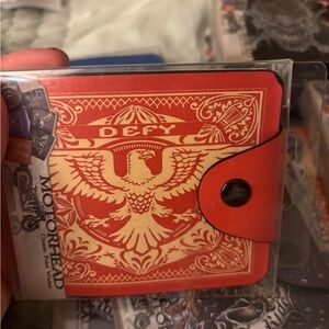 Stylish red card holder with intricate design. Features 'Defy' text and eagle motif.