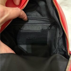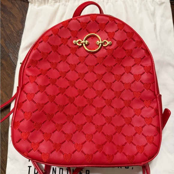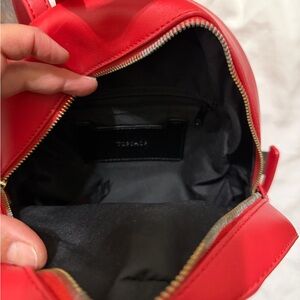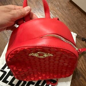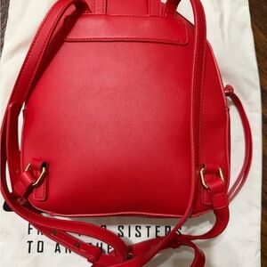 Stylish red designer backpack with elegant gold accents. Perfect for adding a pop of color to any outfit.