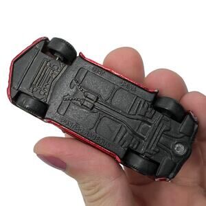 This eye-catching red diecast toy car features bold yellow and black flame decals, adding a sleek, high-speed look to its design. Equipped with a large rear spoiler and sporty yellow-rimmed wheels, this 1:64 scale model is perfect for collectors or racing enthusiasts. The tinted windows and molded body details enhance its realistic appearance. With signs of play wear, this piece carries a vintage, well-loved charm. A great addition to any toy car collection!