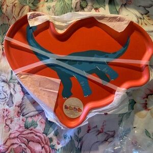 Fun red tray with a blue dinosaur design. Perfect for kids' parties or themed events.