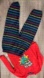 Red long-sleeve top with dinosaur print. Colorful striped pants with elastic waistband.