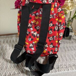 Vibrant red smaller backpack with Mickey Mouse print. Features a front and inside zippered pocket and adjustable straps. Pre-owned, gently worn.