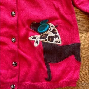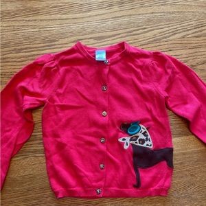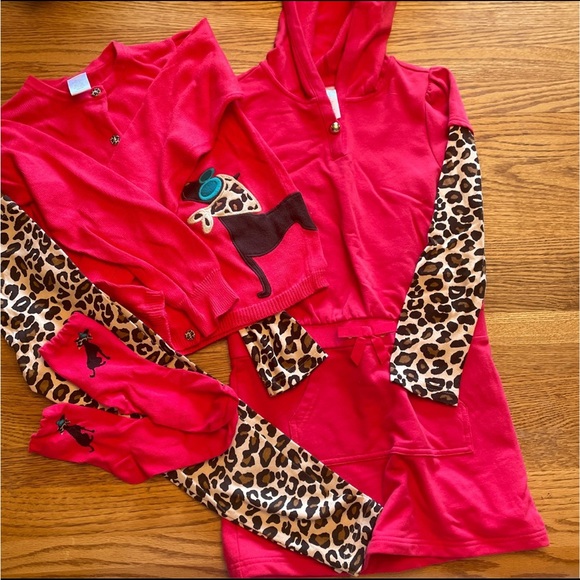 This bundle contains a red sweatshirt dress with a pocket, size 7. The sleeves on the dress are cheetah print. The sweater is size 7-8, has cheetah buttons as well as a dog. The cheetah leggings are size 6. There are also red socks included featuring the dog. Sizes do vary across this bundle however all items are like new.