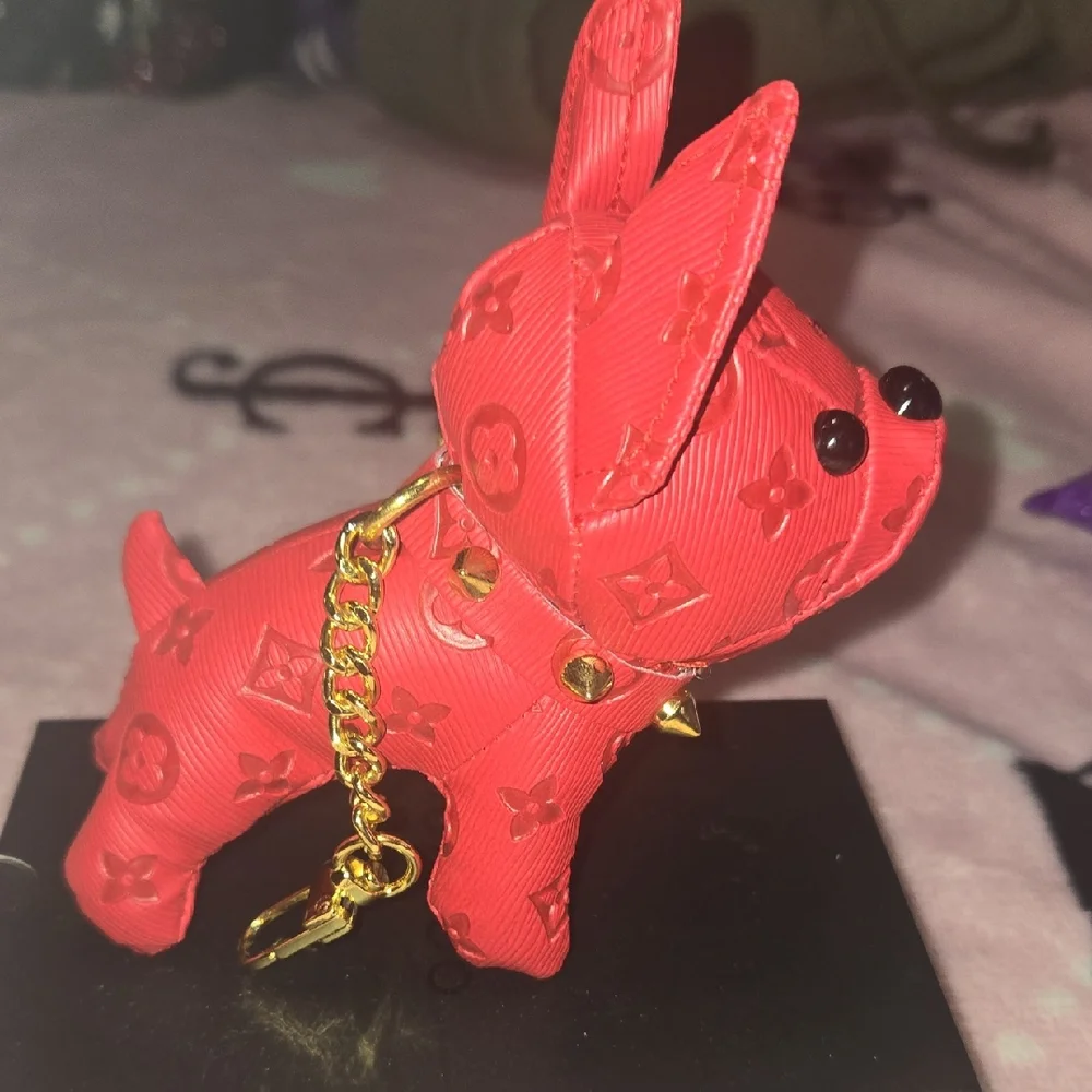 Stylish red dog-shaped keychain with gold-tone chain and stud details. Features textured signature-inspired pattern for a luxury look. Lightweight and durable accessory that adds flair to bags or keys. Bright red color enhances visibility and style.