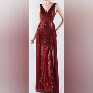 Red, Double V, Beaded Back, Draped Skirt, Sequined Mermaid Gown