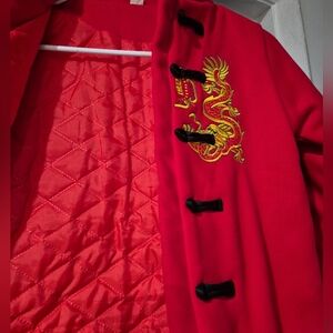 This vibrant red jacket features intricate dragon embroidery, perfect for adding a touch of style to your child's wardrobe. Crafted with attention to detail, it offers both comfort and flair.