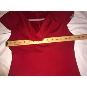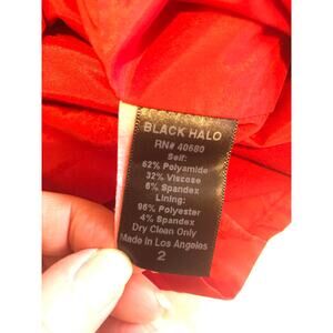 Black Halo Gretchen Pebble Crepe Dress in red. Dress 99% poly, 1% spandex. Lining: 95% poly, 5% spandex. Fully lined. Dry clean only. Draped neckline. Cap sleeves. Center back zipper closure. Made in Los Angeles. Very fitted.