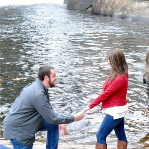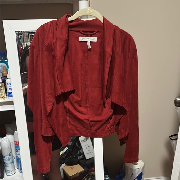 Stylish red draped jacket with a chic design. Perfect for layering. Only worn once for engagement pictures. It’s still like brand new.