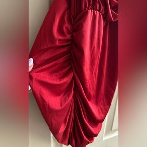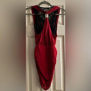 Stylish red draped dress featuring a lace back detail. Perfect for evening wear. Condition EUC