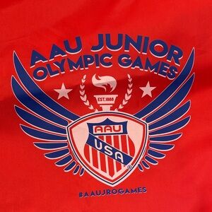 Official red drawstring backpack, which you only obtain when you go to the actual AAU Olympic Games. Lightweight and durable for kids' activities. Perfect to throw your running spikes into. Blue drawcords and bold AAU USA logo for easy recognition. Simple carry design ideal for practices and events.