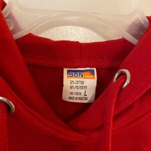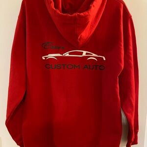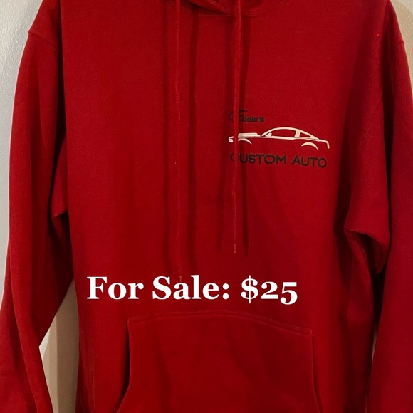 Red hoodie with Eddie’s Custom Auto logo on the front and back. Women’s size large but it fits more like a size medium. Made in Pakistan. Polyester and cotton blend. Drawstring hood. Like new, only worn twice and washed.