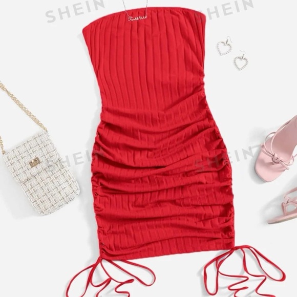 Red Drawstring Ruched Bodycon Dress