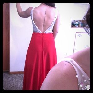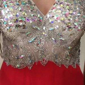 Bright red dress has only been worn once! It has a slit on the left side. Very pretty gems and detailing on the top.It was altered on sides a little to make it a little more form fitting. ****Able to ship the business day the dress is ordered or the following business day****