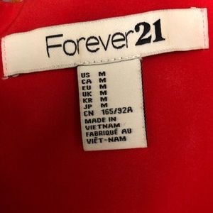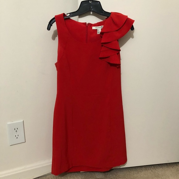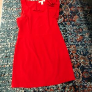 Bright red sleeveless dress. Ruffle detail on front and back of shoulder. 93% polyester and 7% spandex.