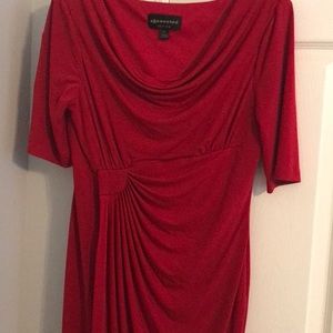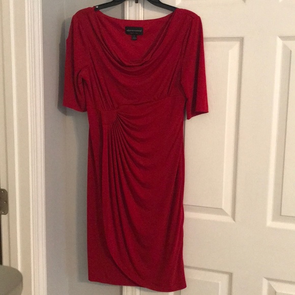 Perfect Valentines Day outfit! Great Red flowy dress! The front is designed to hide any unwanted attention. Fabric is like spandex but doesn’t over hug the figure. I have wore once and got lots of compliments! (Size is 10p but I am 5’4 and goes right past my knees)