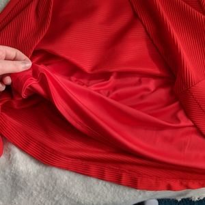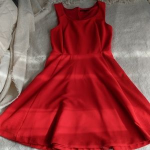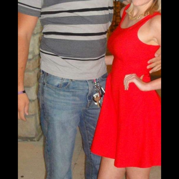 Red dress with a gold button on back. Semi-formal. Fits more like a small. Worn once.