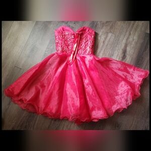 Made of Organza fabric with beading along the waistline and a sweetheart neckline with a corseted back. The sizing stands between a medium and a small.