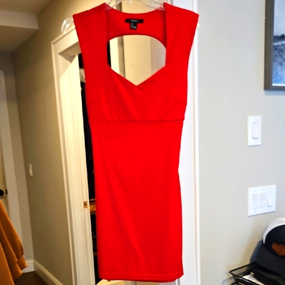 Red dress sleevless with criss cross back design. polyester, rayon/ spandex material.