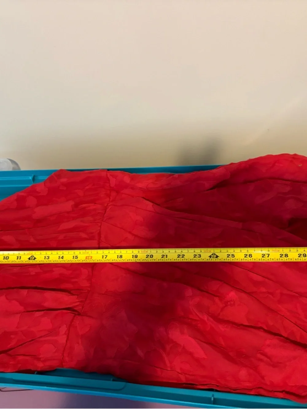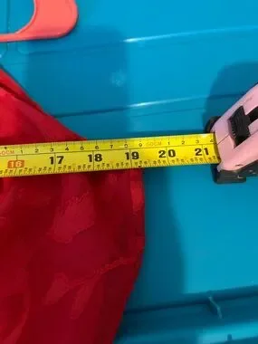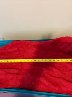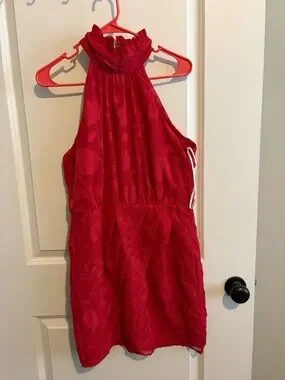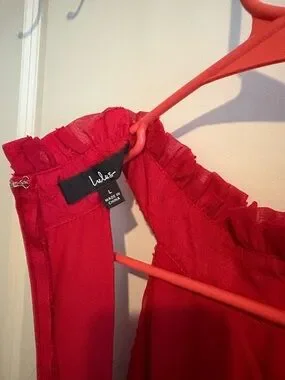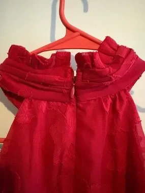 Eye-catching red strapless dress with delicate ruffle trim. Mid thigh length, smooth, structured bodice with clean lines. Perfect for evening or special occasions.