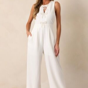 Experience ultimate comfort and style in our Luminous Bliss White Sleeveless Jumpsuit! Featuring a sleek design and sleeveless cut, this jumpsuit will have you feeling effortlessly chic. Its soft and luminous fabric will keep you cool and comfortable all day. Rock this jumpsuit in any season for an effortlessly stylish look! This white jumpsuit features a round neckline, a discrete back zipper, three ornate bows embellished with faux ivory pearls and rhinestones, a chest cutout, a thick waistband, subtle pleats, functional hip pockets, and a wide leg design.