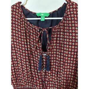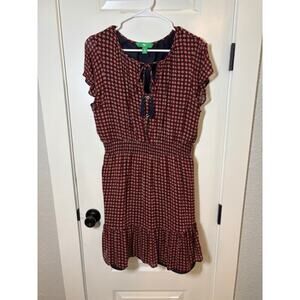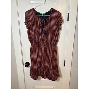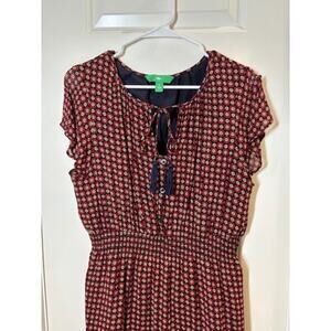 This beautiful red and blue dress is perfect for any occasion! It features a flattering tie with tassels and button-up detailing.