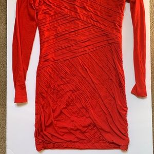 Bod Con red dress by torn by ronny kobo with pleated detailing all over front, plain red background. Rayon and Spandex. good condition. small medium.