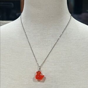 Charming red duck pendant on a silver chain. Perfect for adding a playful touch to any outfit.