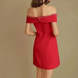 Red Elegant Women's Off Shoulder Rhinestone Trim Ruched Bust Dress