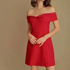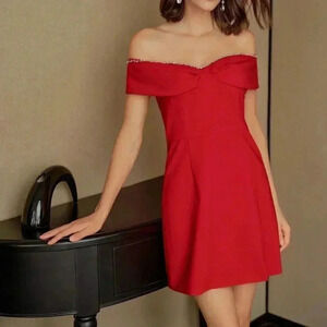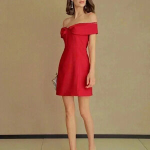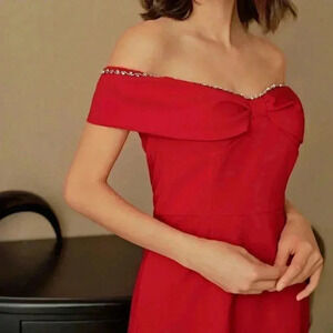 Red Elegant Women's Off Shoulder Rhinestone Trim Ruched Bust Dress