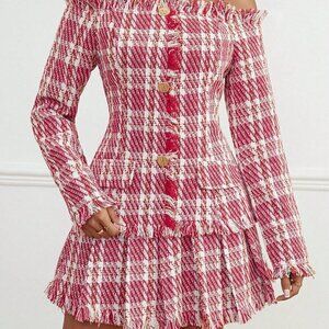 Red Elegant Women's Off-Shoulder Collar Raw Hem Detail Tweed Jacket And Skirt