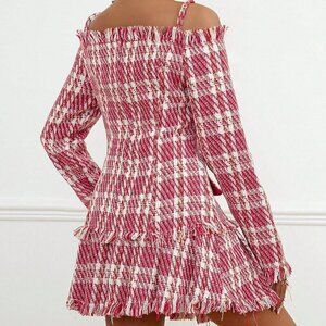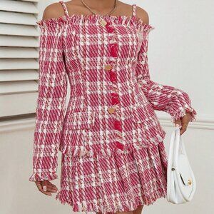 Red Elegant Women's Off-Shoulder Collar Raw Hem Detail Tweed Jacket And Skirt