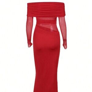 Red Elegant Women's Off-Shoulder Long Mesh Hollow-Out Bodycon Dress